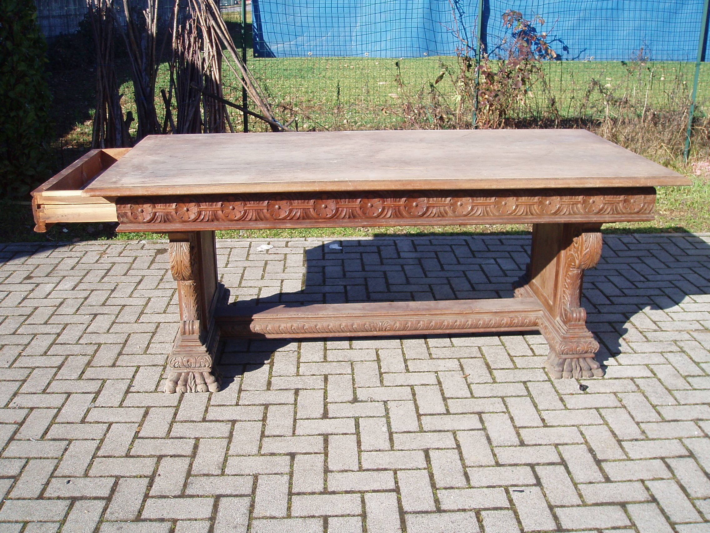 databile nella seconda metà dell’800, con gambe a zampa di leone e bordo perimetrale decorato a roselline. E’ dotato di ampi cassetti sui lati frontali. Il piano misura 200 x 100 cm ed è laminato in noce. Necessita di restauro per i particolari.