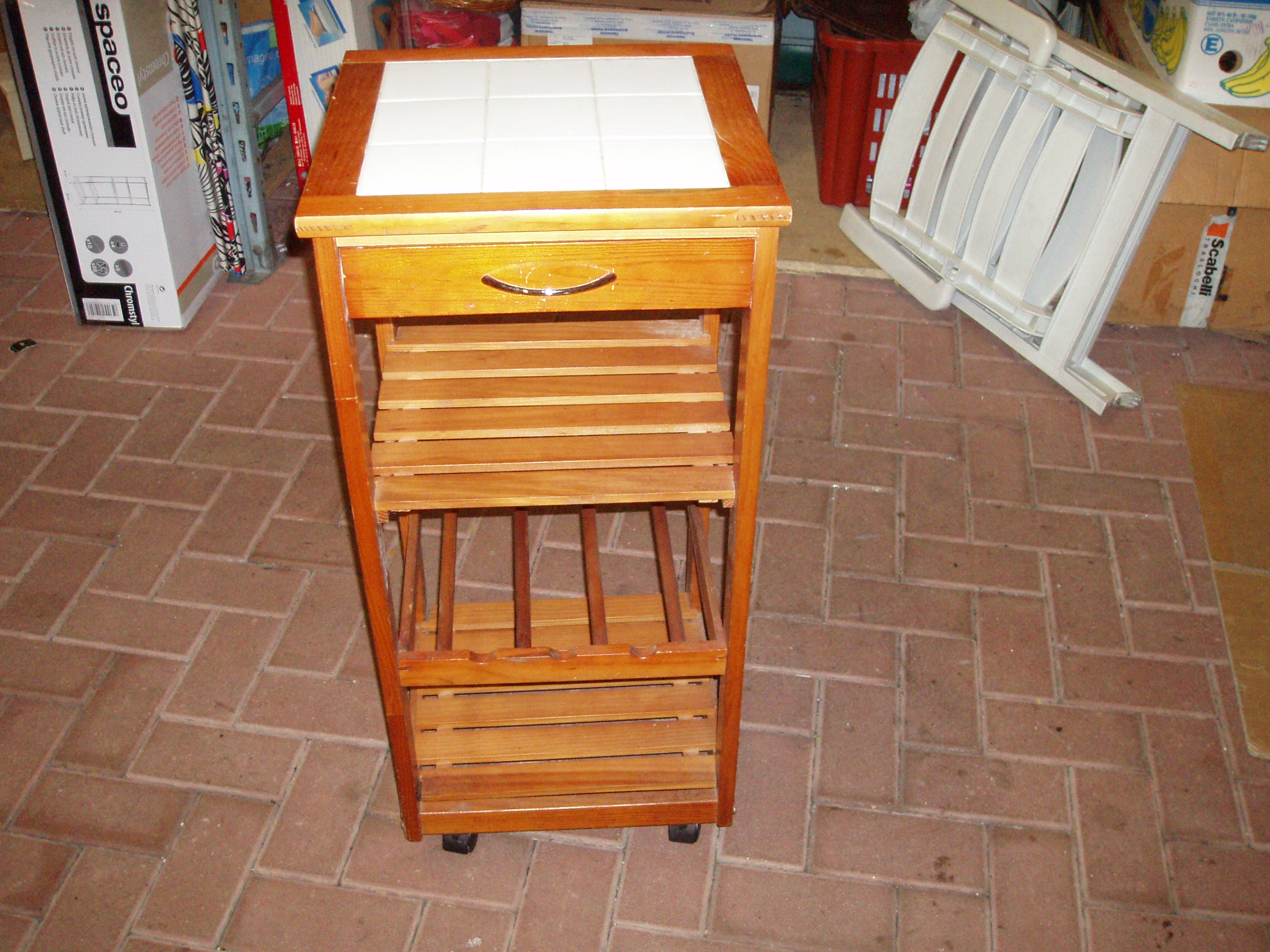 in cucina o bagno. Realizzato in legno con piano superiore dotato di piastrelle bianche, misura 80x38x38 cm ed è dotato di tre ripiani più un cassetto. Pratico ed elegante, si presenta ancora in ottime condizioni, con un disegno molto gradevole per l’arredo della casa.