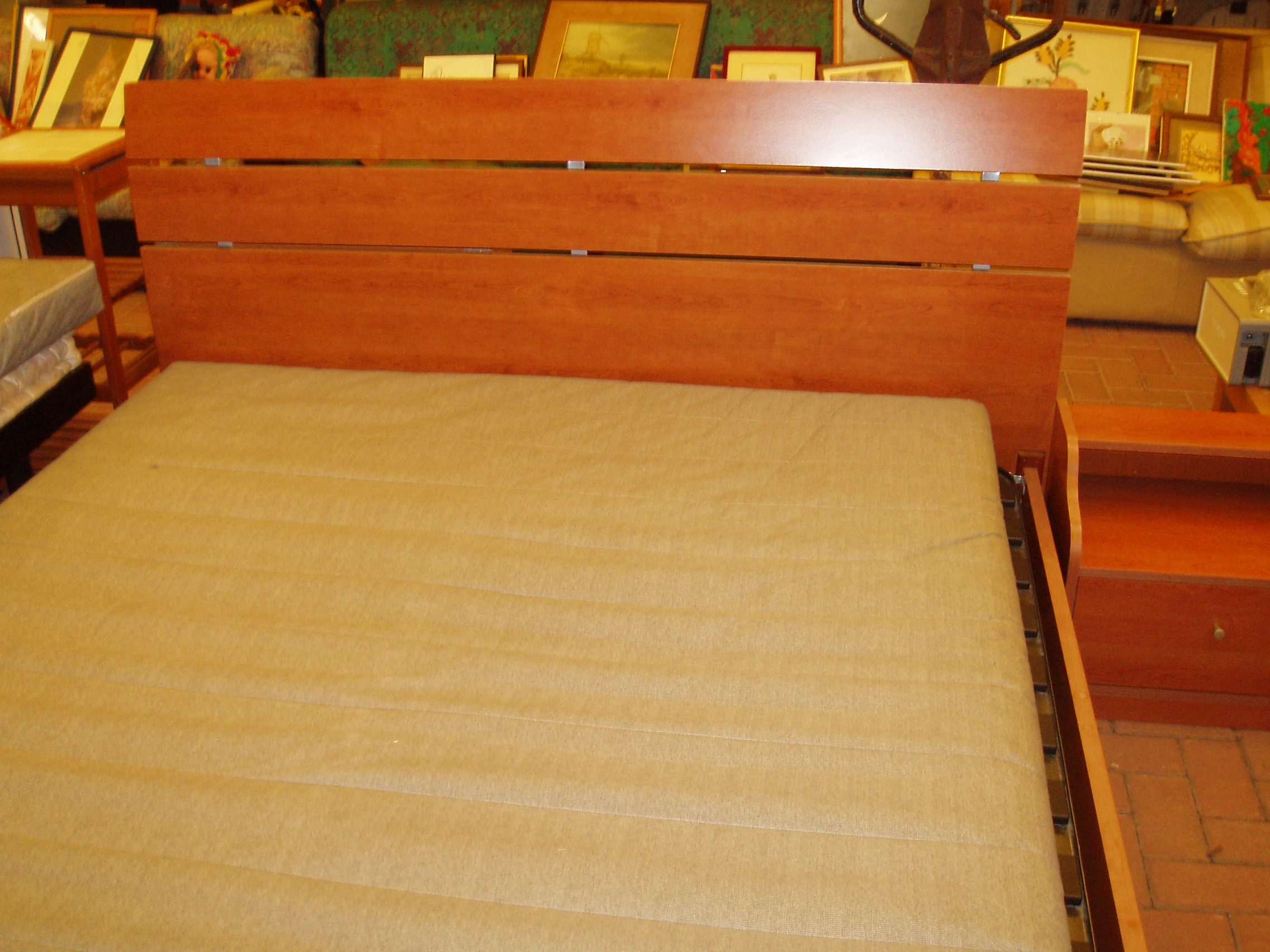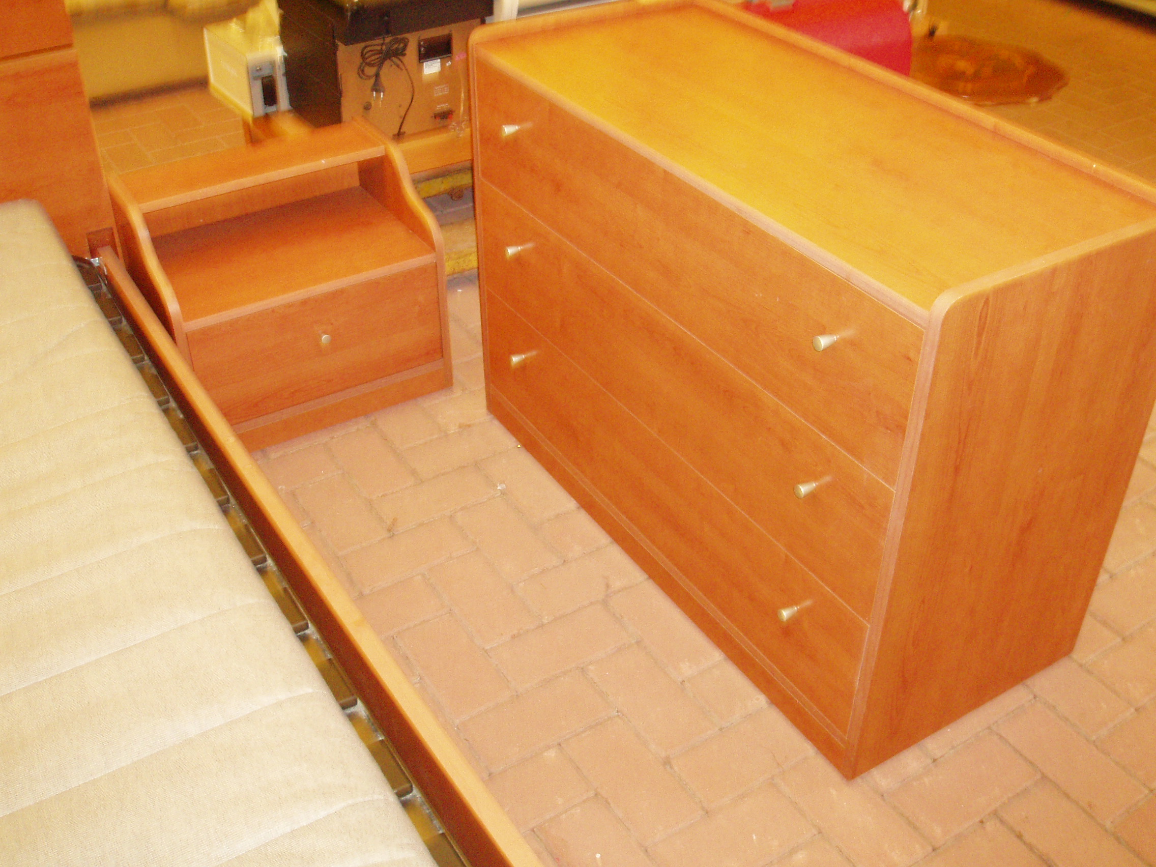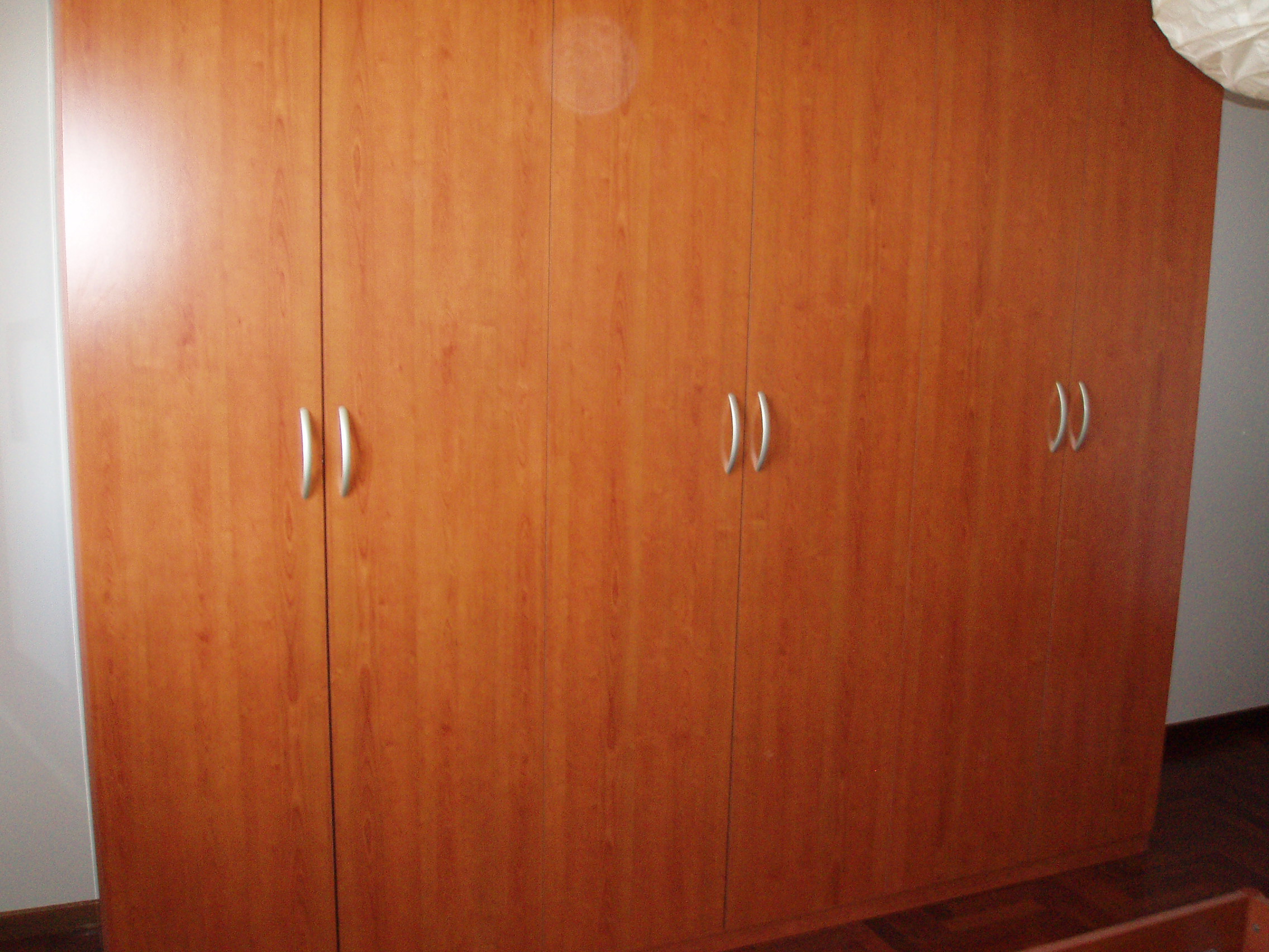 matrimoniale color ciliegio dotato di letto con rete a doghe, armadio a sei ante lunghe, comò a tre ampi cassetti e un comodino. L’armadio misura 2,45 mt di altezza e 2,75 mt di larghezza e presenta 6 vani appendiabiti senza cassetti interni. La camera è in buone condizioni.
