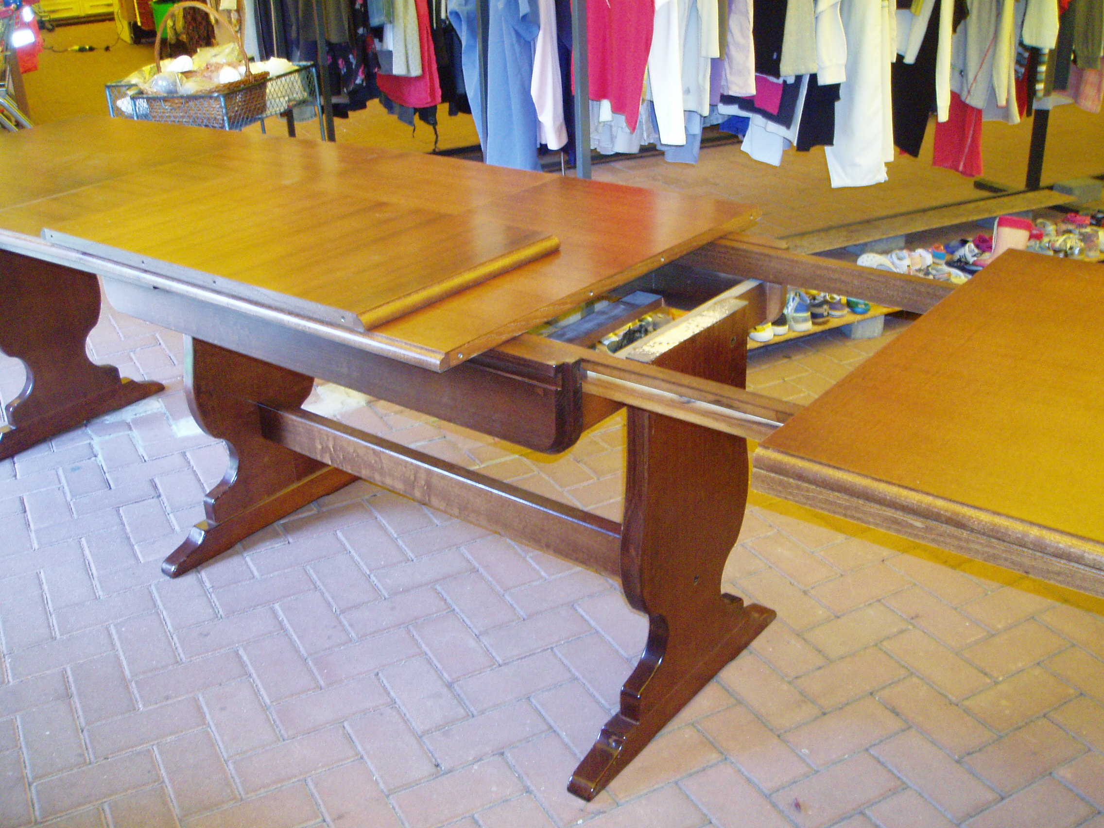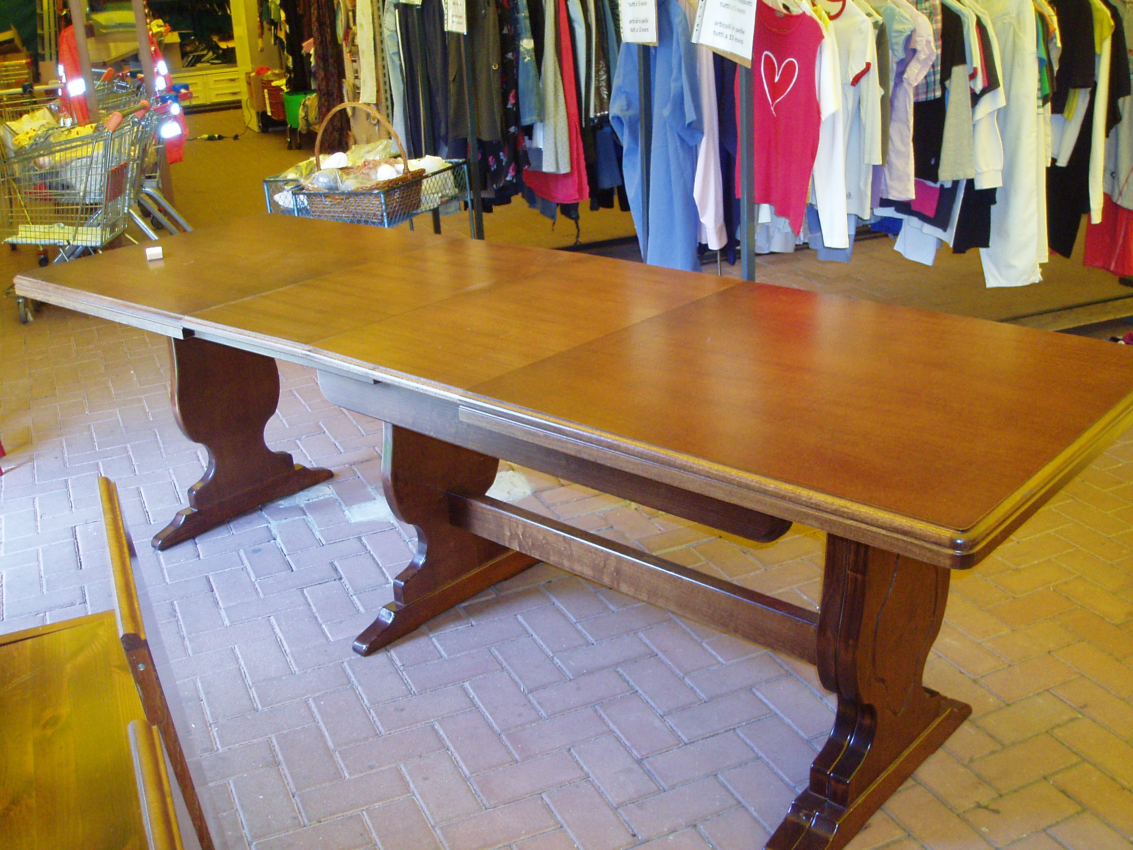 in noce scuro per sala grande o taverna lungo 180 cm, largo 85 cm e alto 80 cm. Dotato di doppia gamba per consentirne sempre la massima stabilità, è allungabile progressivamente sino a 360 cm grazie a 4 prolunghe utilizzabili anche solo in parte. Il tavolo è in legno massiccio e si presenta ancora in ottime condizioni. Una vera occasione per chi ha spazio e ama le cose