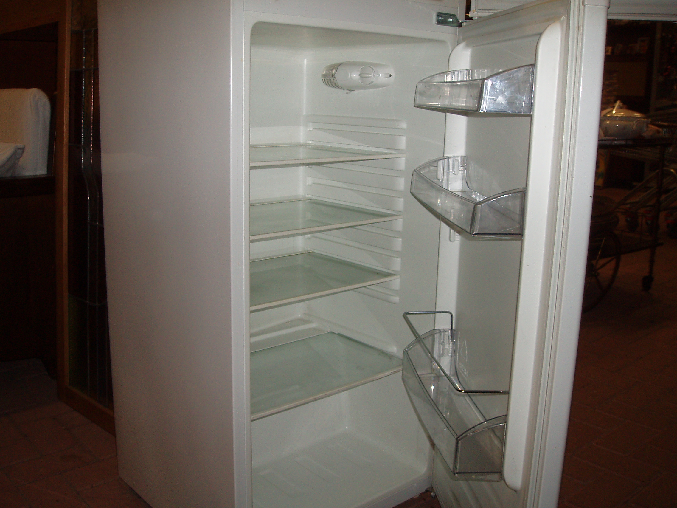 di colore bianco dotato di vano frigo e vano congelatore. Il frigo è di classe energetica A+ ed ha capienza di 170 + 45 litri. Al frigorifero mancano il ripiano intermedio del vano congelatore e la vaschetta per la frutta sotto in basso al vano frigo. L’elettrodomestico funziona perfettamente e si presenta in buone condizioni.