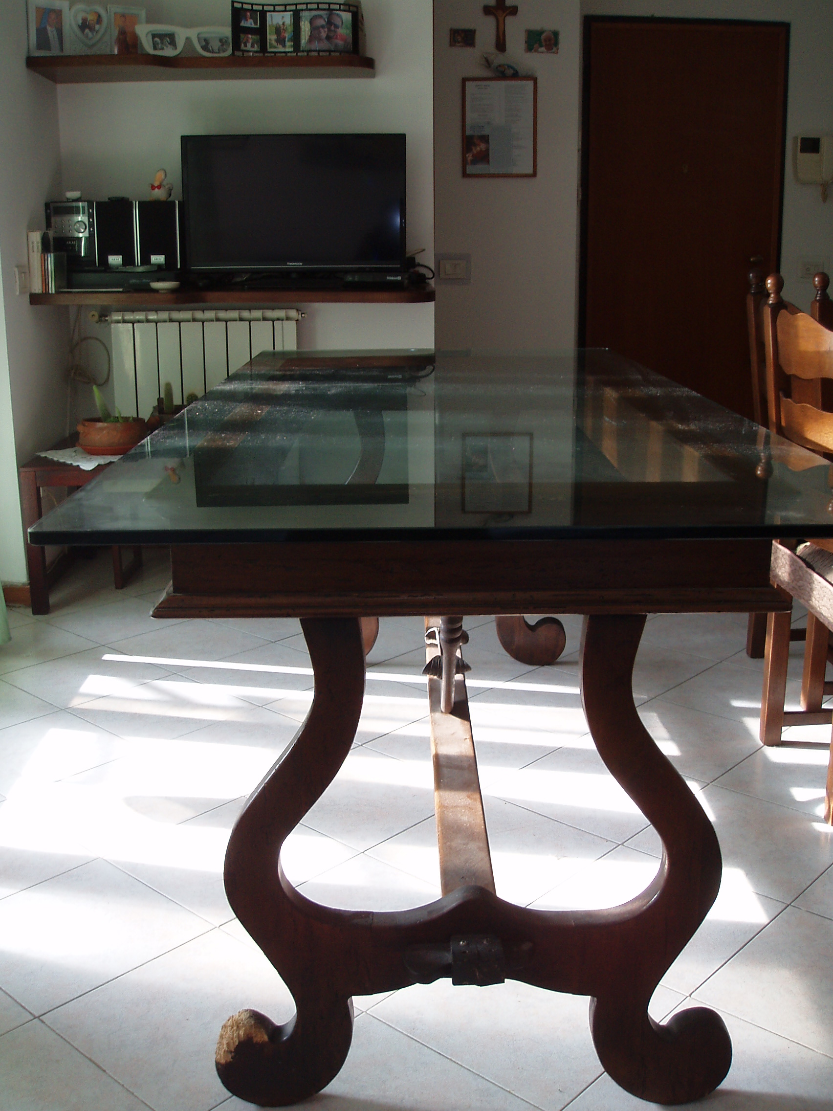 Il mobile è già stato restaurato e si presenta in buone condizioni. Il piano in cristallo è molato sui bordi e misura 200×90 cm ed ha uno spesso re di 16 mm mentre la base in legno massello ha un piano da 165x72cm e presenta sotto la struttura due onde in ferro battuto caratteristiche. Epoca stimata della struttura in legno seconda metà dell’800. Una vera occasione: solo il prezzo del cristallo ripaga la spesa senza contare il tavolo d’epoca…