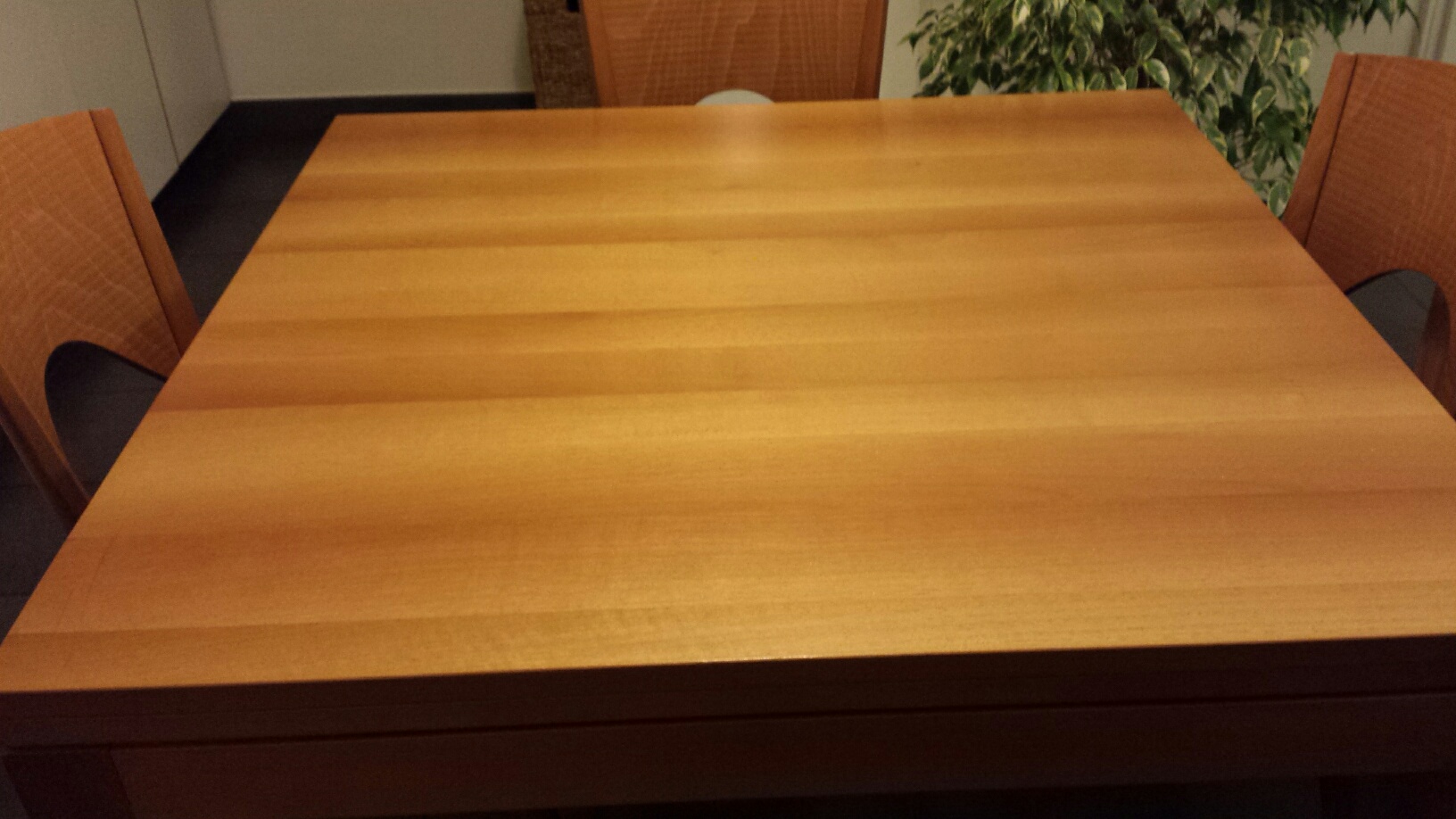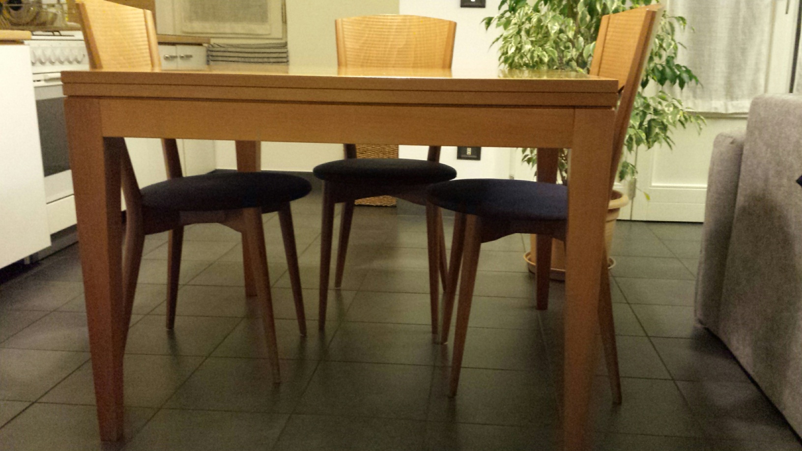 color noce con quattro sedie in stile e seduta blu. Il piano del tavolo misura 1 mt x 1 mt ed è apribile a libro per una lunghezza totale di 2 metri. Le sedie, come il tavolo sono in ottime condizioni. Un’occasione da non perdere!