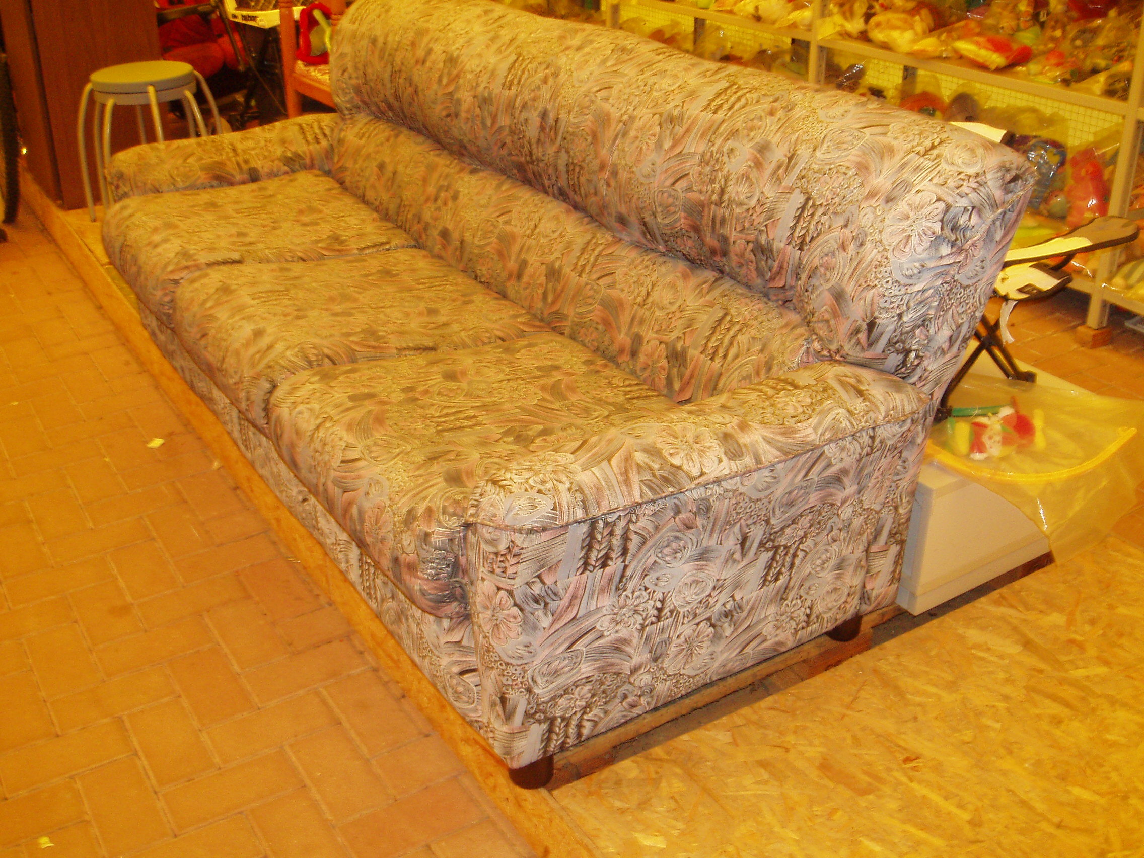 con cuscini sfoderabili, trama a fantasia grigio fumo e rosa. Dimensioni esterne 200 cm di larghezza, 90 cm di profondità, 80 cm di altezza. Il rivestimento è esteticamente perfetto e l’imbottitura dei cuscini nuova. Una vera occasione.