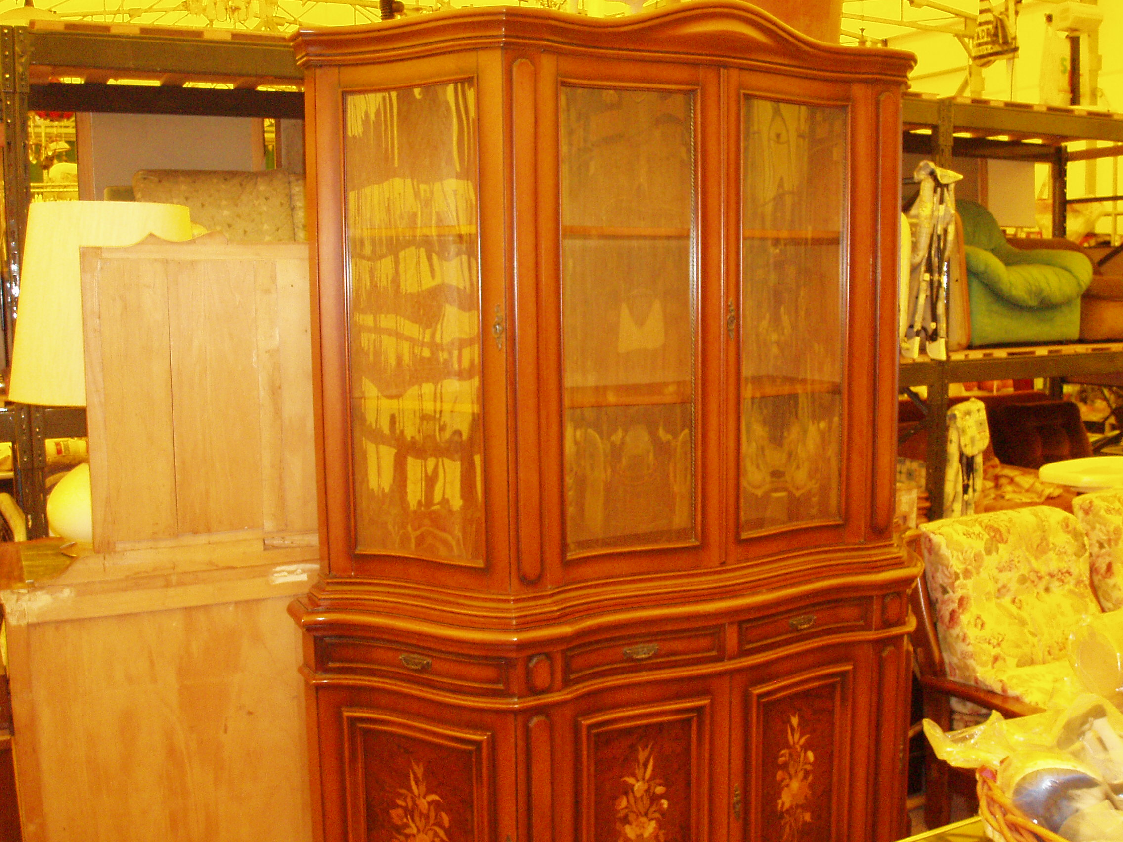 con antine finemente incise con motivi floreali, vetrina superiore e cassetti centrali. La credenza, color noce classico, misura 175 cm di larghezza, 45 cm di profondità e 210 cm di altezza.