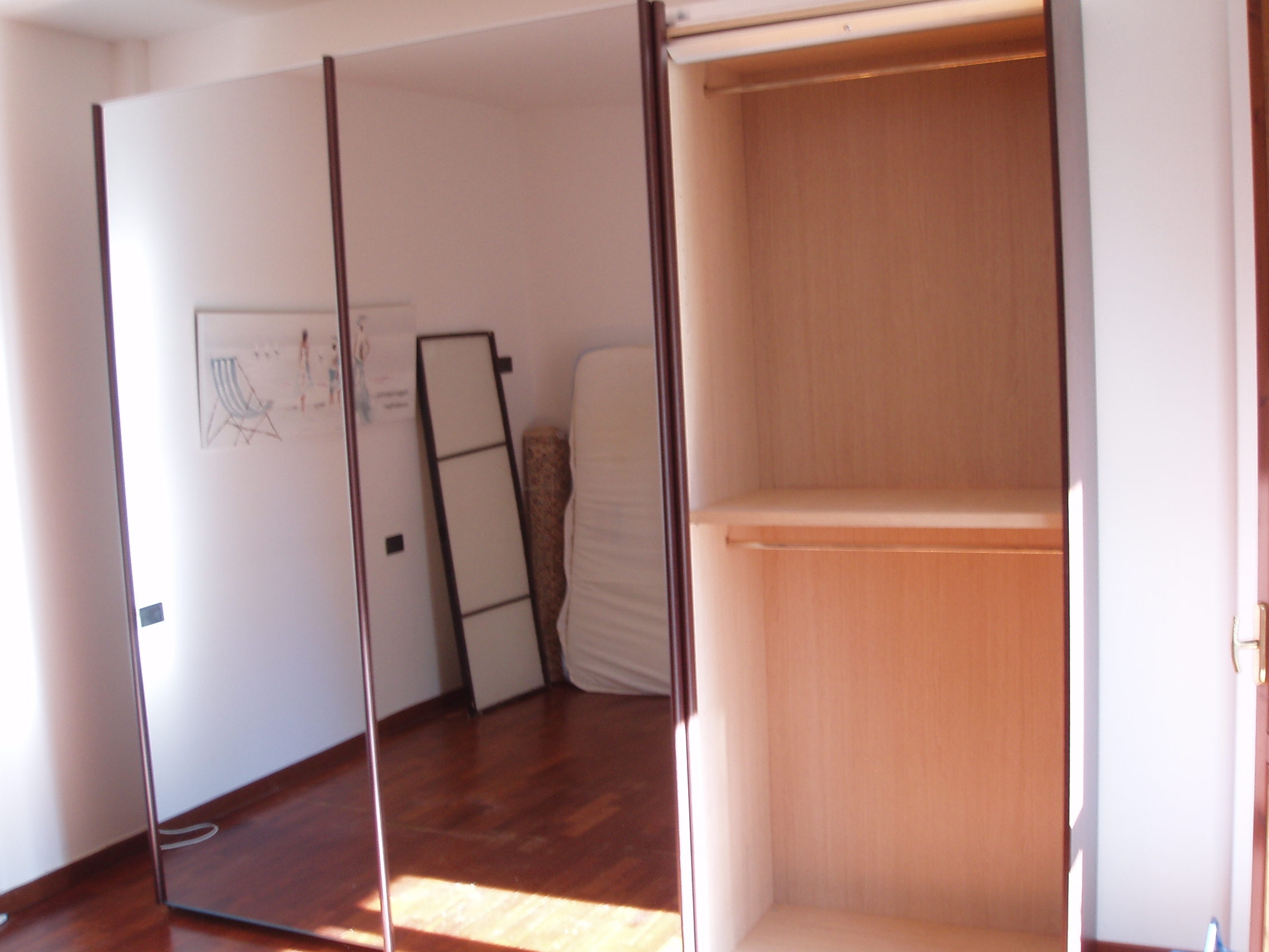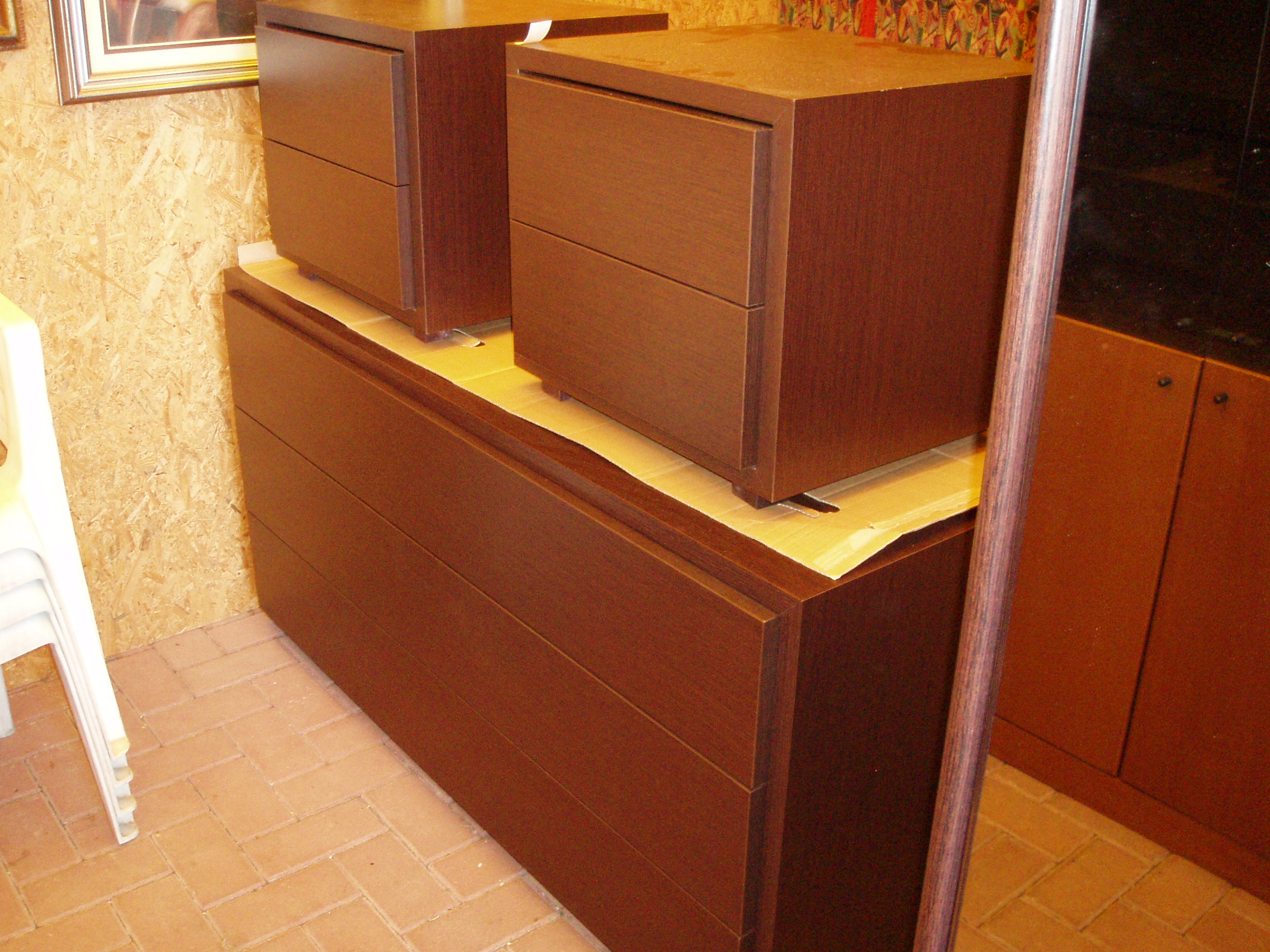 ad ante scorrevole a specchio, comò, due comodini e letto con contenitore sotto la rete che si alza su due pistoni laterali. L’armadio a tre ante scorrevoli prevede due cassettiere e ripiani appendiabiti e misura 250 cm di altezza e 270 cm di larghezza. Il comò a tre cassetti, apribili a pressione, come i comodini, è largo 140 cm. Il letto matrimoniale ha la rete con doghe e e il rivestimento perimetrale e lo schienale in pelle scura. I vari componenti si presentano ancora in ottime condizioni.