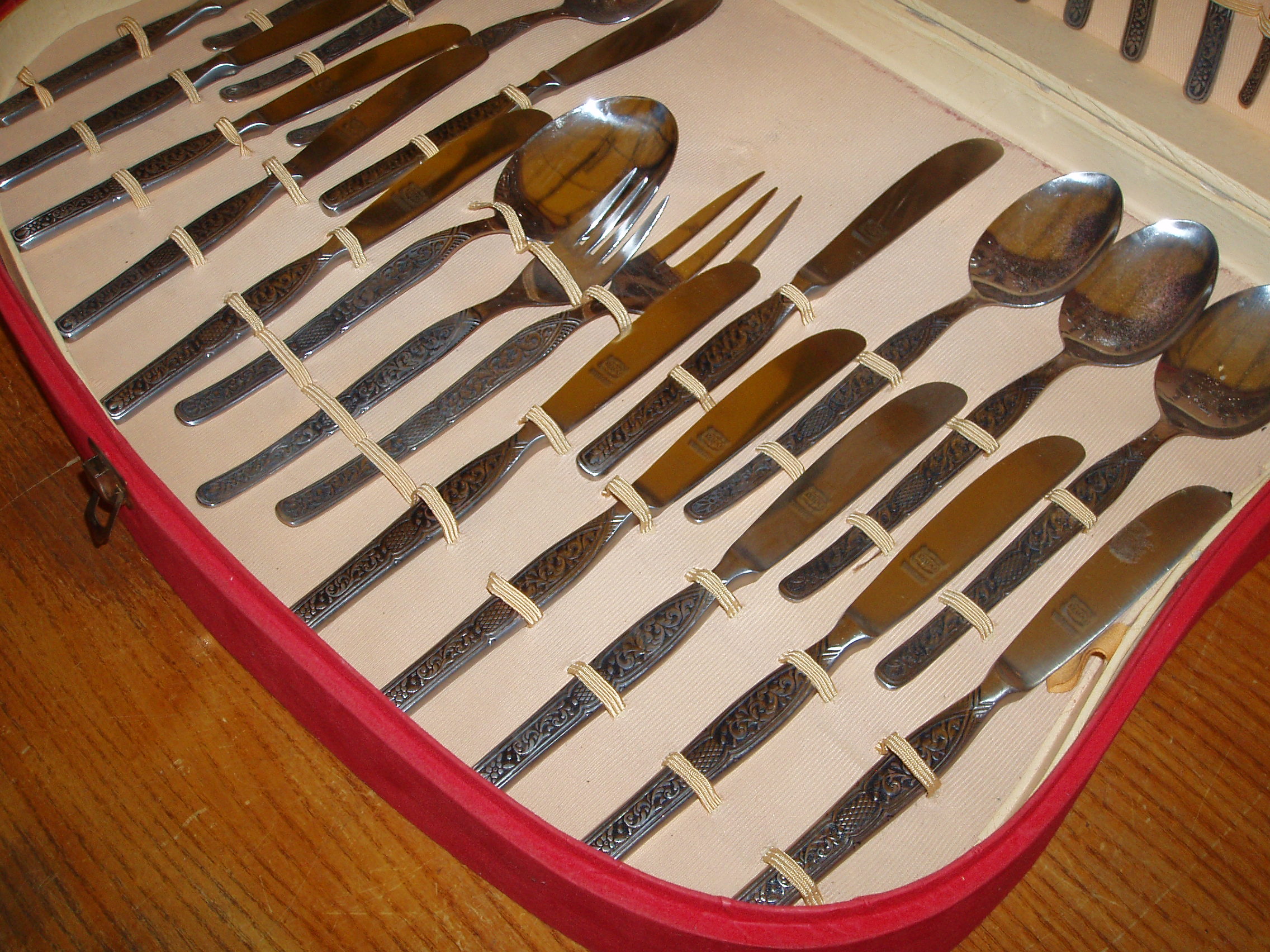 con manico finemente lavorato, in ottime condizioni. Comprensiva di 12 cucchiai, 12 cucchiaini,12 forchette, 12 coltelli, una forchetta grande e un cucchiaio grande.