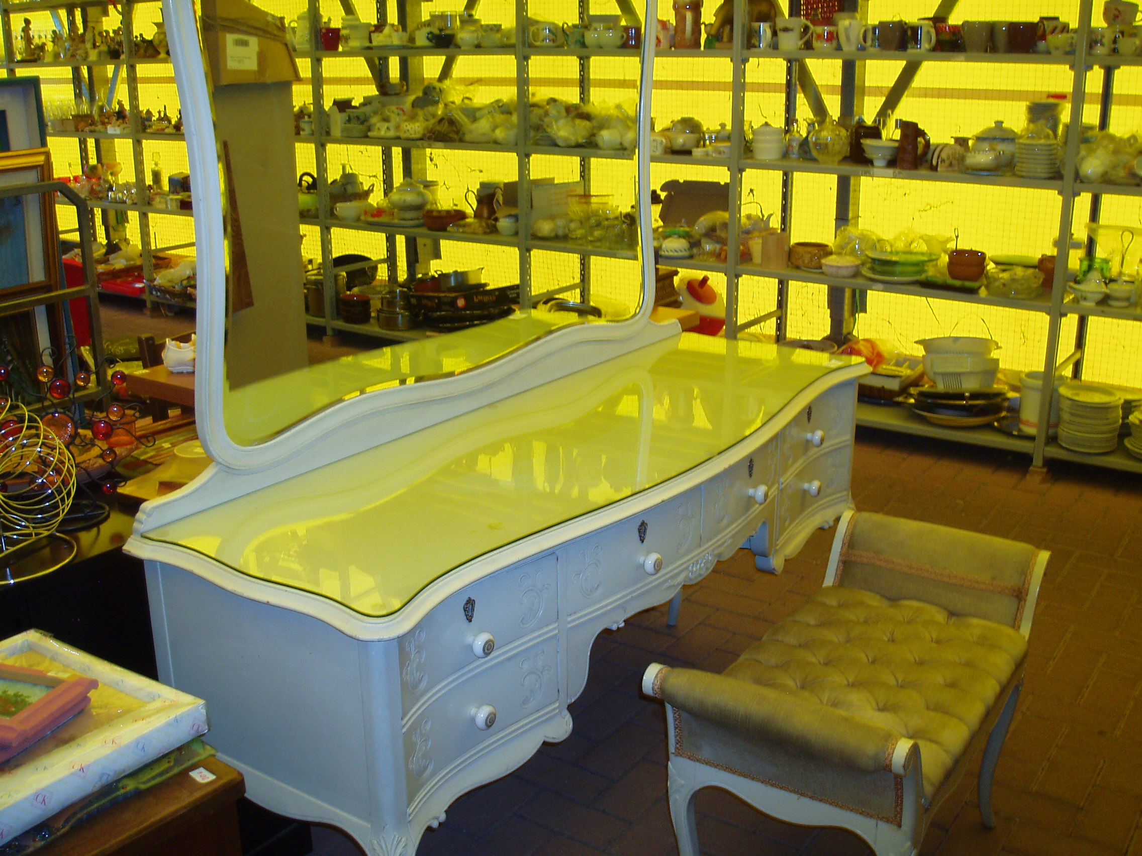 in ottime condizioni, con ampia specchiera e bellissimo sgabello imbottito in stile. Il piano è rivestito in vetro. Il mobile misura 160 cm di larghezza, 55 di profondità e 80 cm di altezza (il piano di trucco).