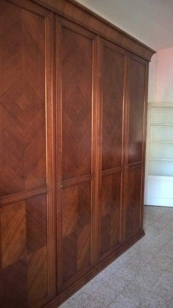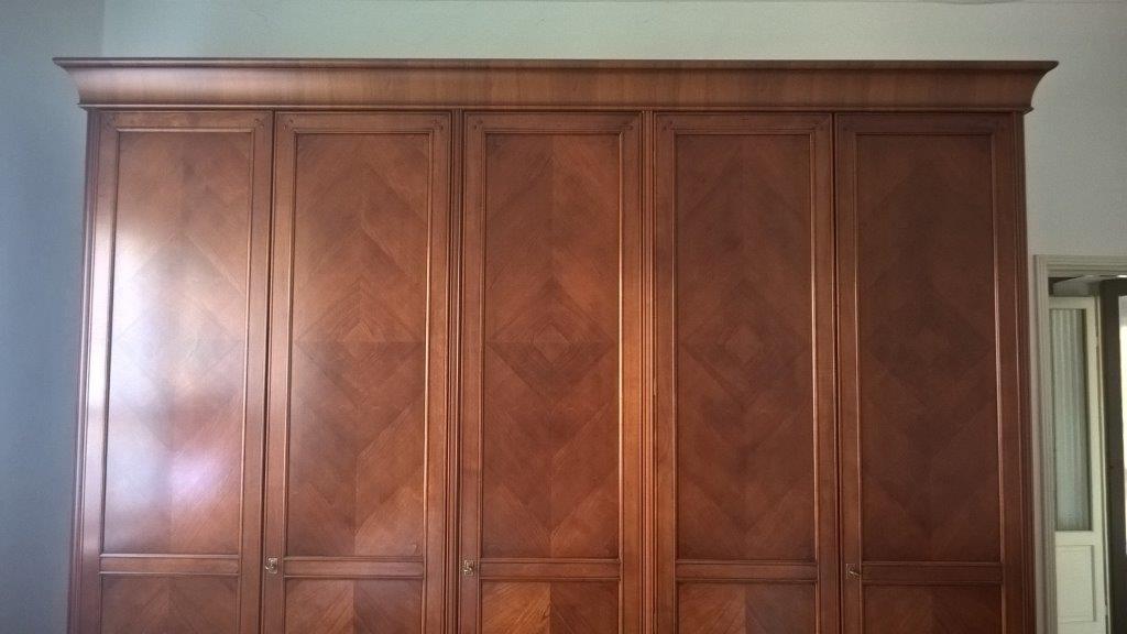 largo 297 cm e alto 255 cm. L’armadio dispone all’interno di ampia cassettiera a tre cassetti e vani appendiabiti. Come nuovo, una vera occasione. Possibilità di abbinamento con comò e comodini dello stesso stile.