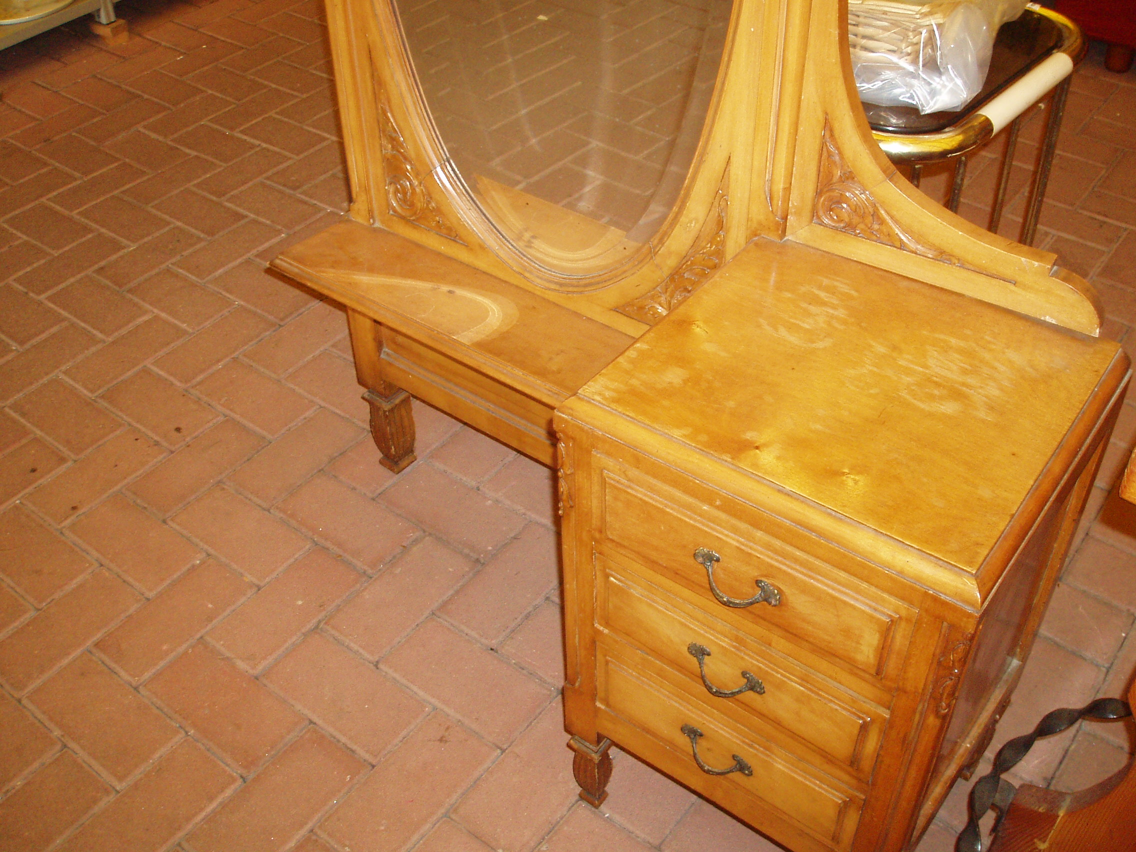 con specchiera ovale, mensolina sotto di appoggio e tre cassetti. Realizzato interamente in legno massello chiaro, il mobile misura 93 cm di larghezza, 175 cm di altezza e 34 di profondità. Il vetro è molato e la cornice in legno e le gambe del mobile sono intagliate con motivi floreali.
