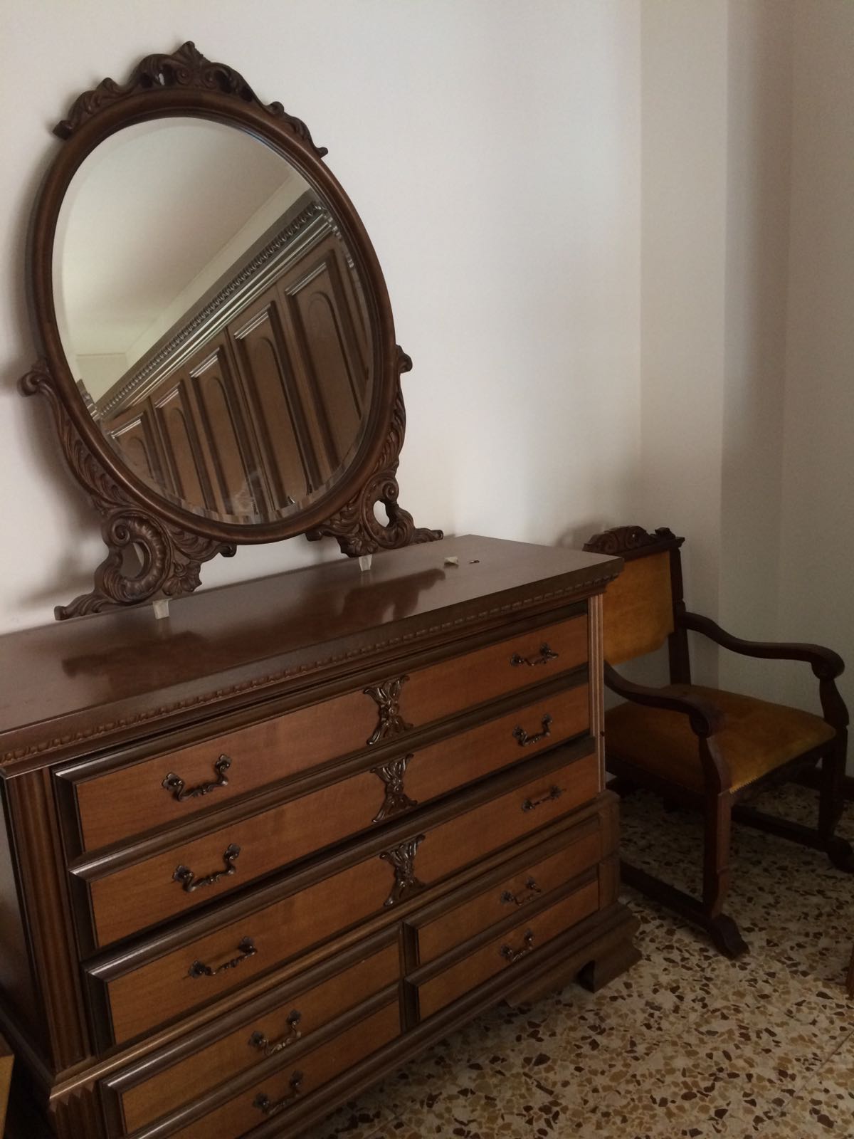 con armadioa sei ante e sei cassetti sotto, letto matrimoniale con testata finemente decorata, due comodini e comò in stile a dieci cassetti con specchio ovale , il tutto in ottime condizioni. La rete del letto è in ferro. L’armadio misura 305 cm di larghezza, 232 cm di altezza e 58 cm di profondità. Le ante sono dotate di specchio interno, ripiani e appendiabiti.