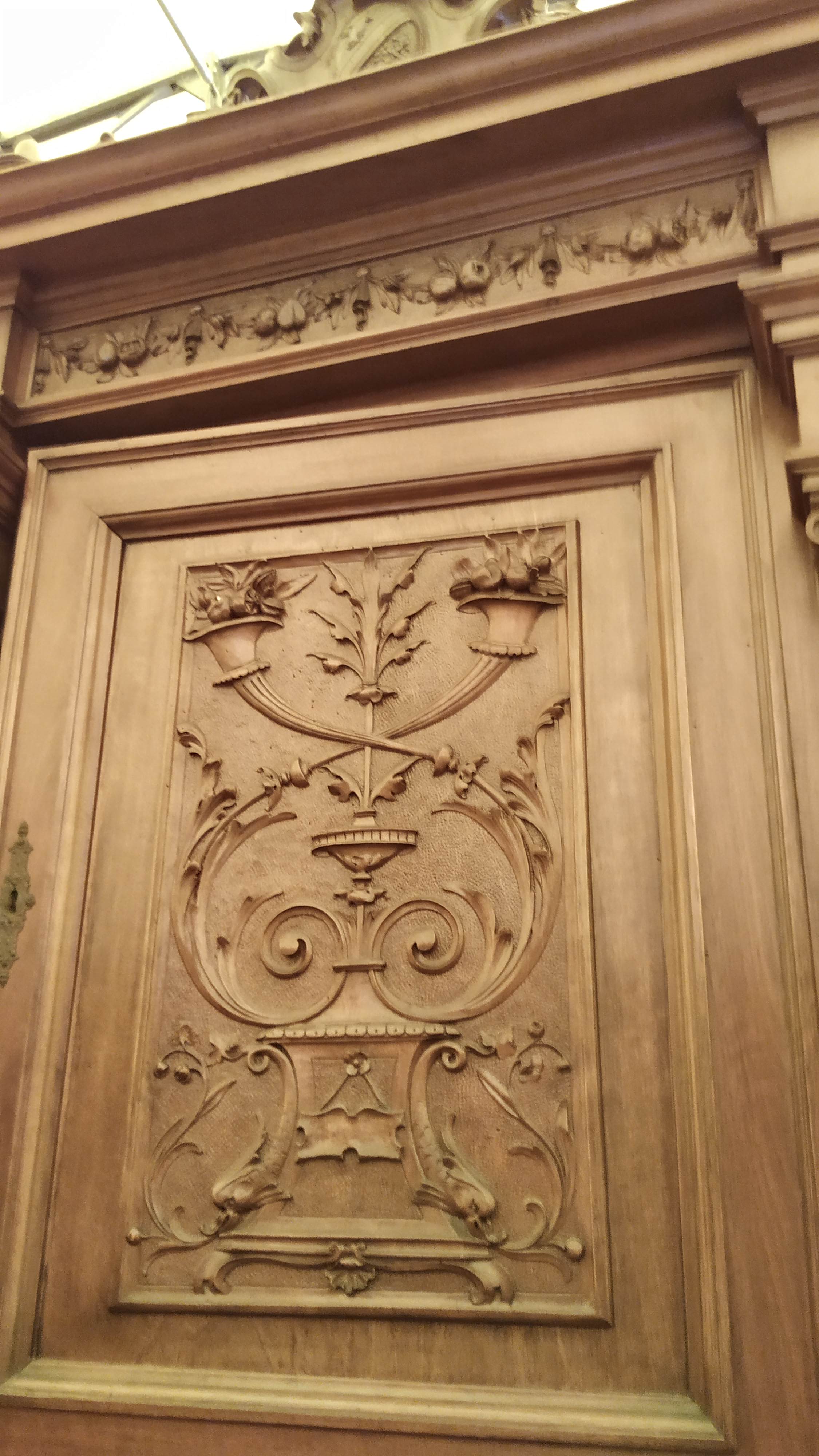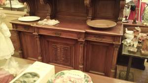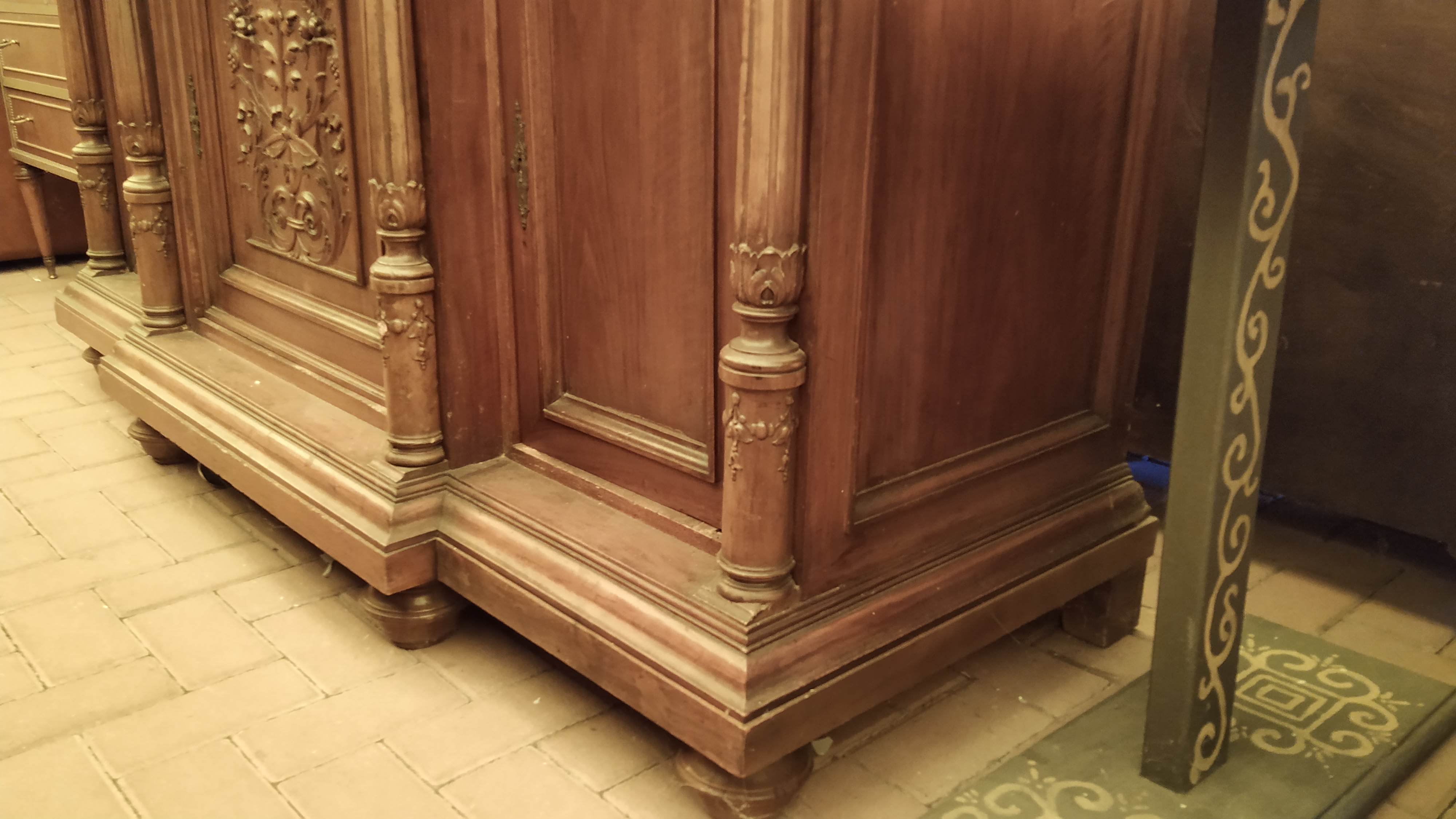 in legno massello di fine 800 con tre ante sopra e tre ante nella base finemente decorate. La credenza è larga 180 cm, profonda 70 cm e alta 280 cm ed è ancora in ottime condizioni; richiede un intervento antitarlo e stuccatura di una crepa sul piano intermedio.