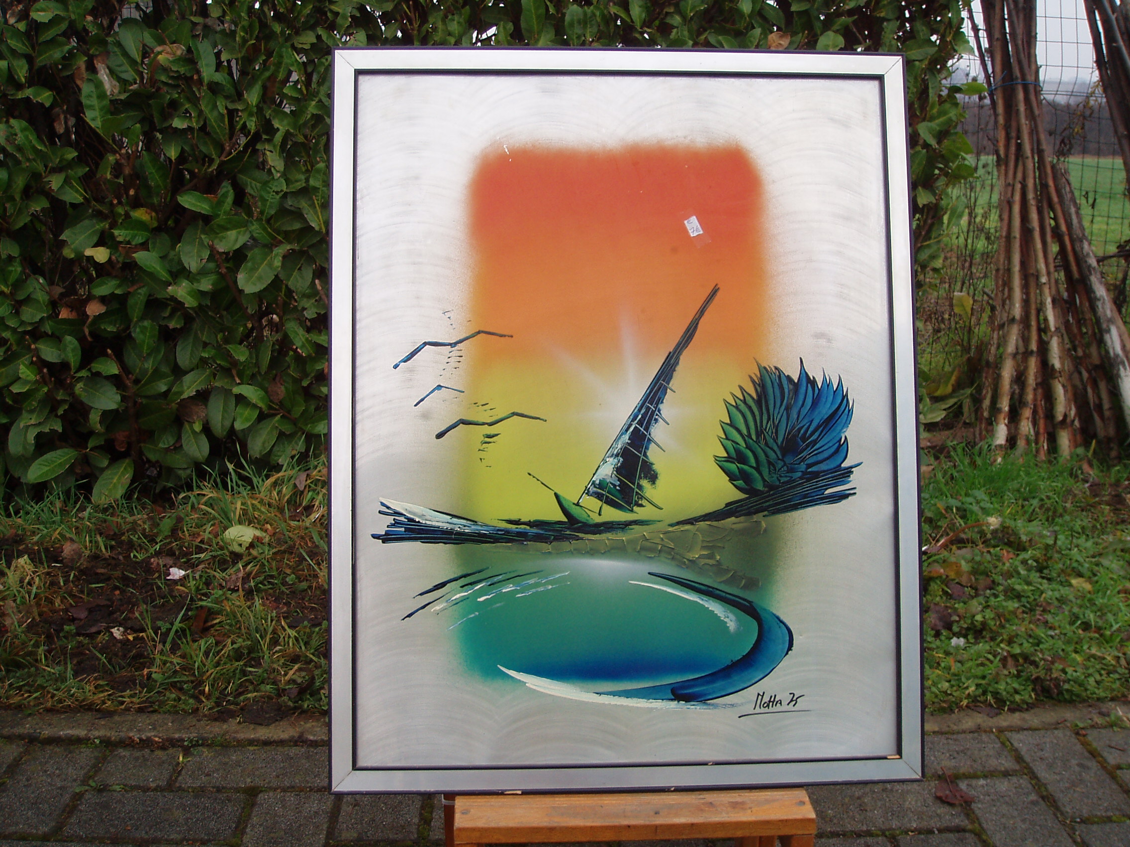 Dipinto firmato su tela. Tempera in cornice moderna a tema paesaggistico.