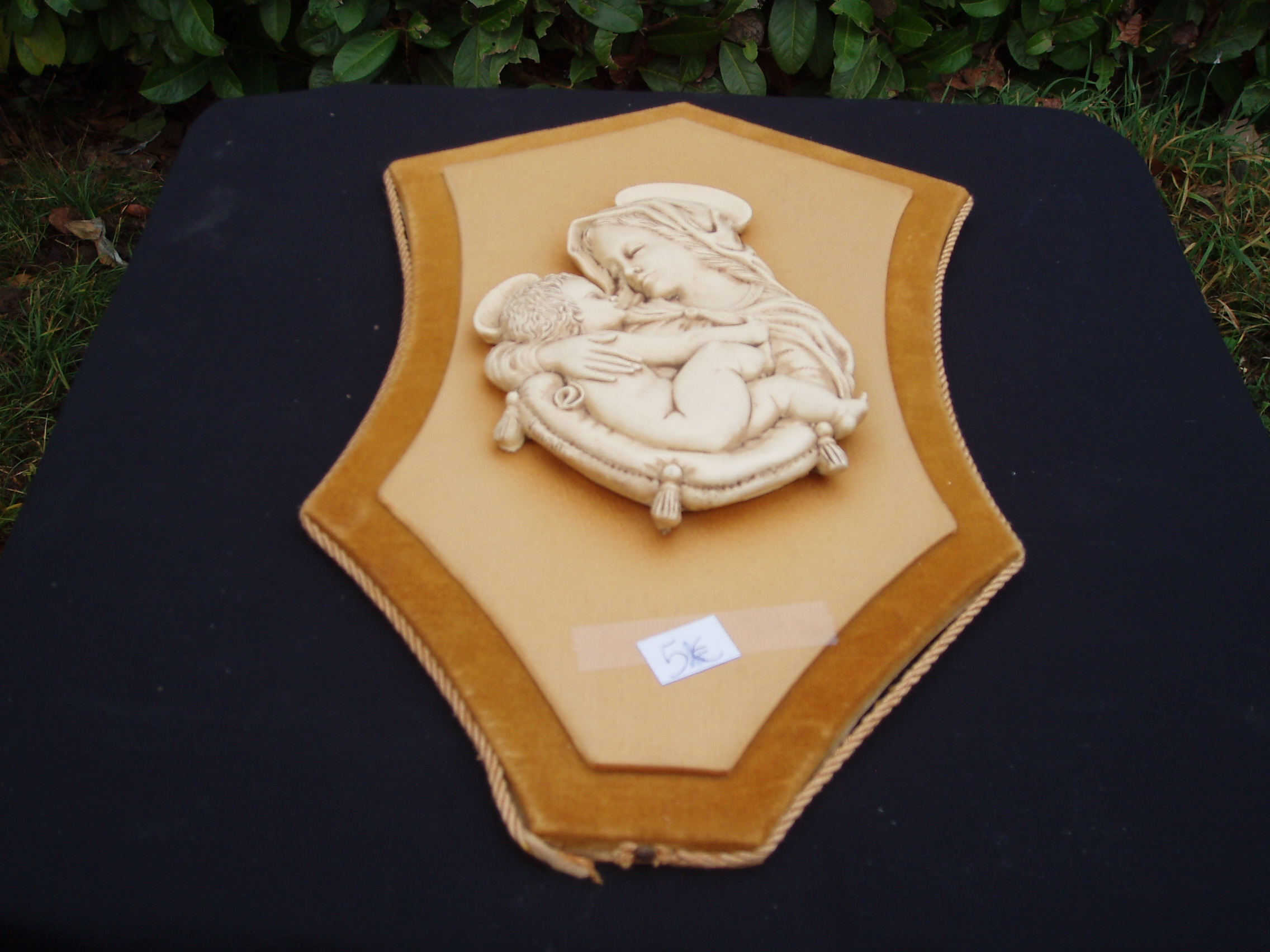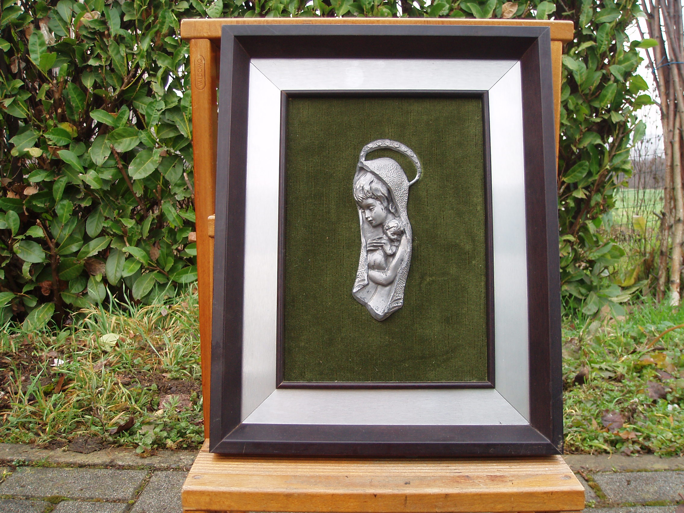 Cornice con scultura in peltro della madonna col bambino. In ottime condizioni.