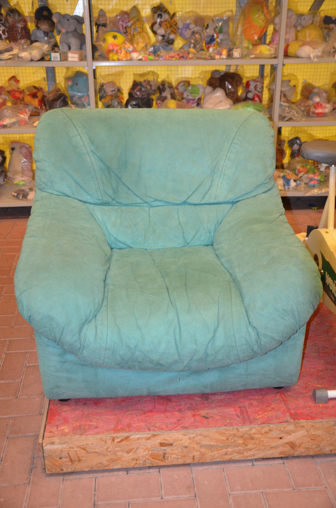 Poltrona in raso verde, cuscino e schenale sfoderabili. In ottime condizioni.